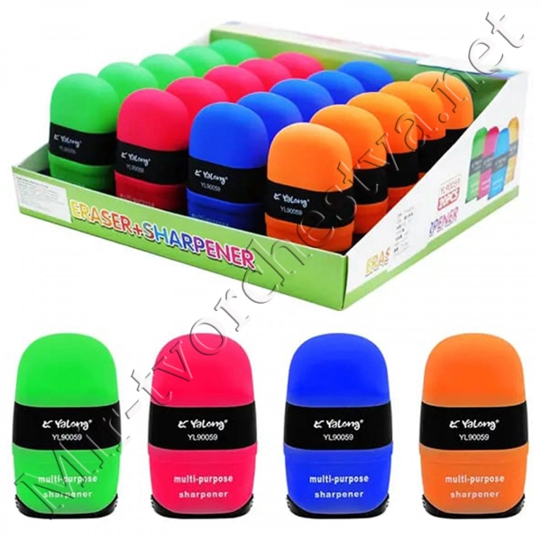 Точилка Неоновая 2 отделения с ластиком, Yalong