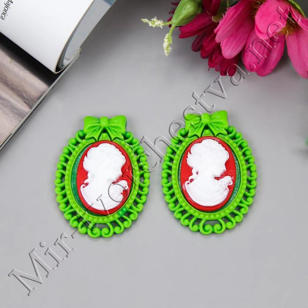 Набор основа для камей "Бант" 3.8x2.7см + камеи "Дама" набор 4шт. 2.5x1.8см
